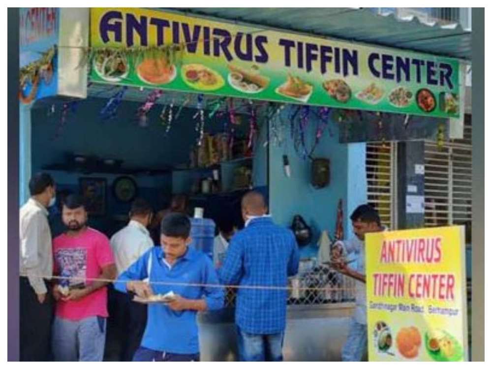 A tiffin centre in Berhampur, Odisha named Antivirus Tiffin Centre has come up with novel and creative ways to attract customers. The dishes sold here are supposed to be antivirus dishes and includes idli, puri, upma, dosa, samosa, vada, pakodi and aloo chop.