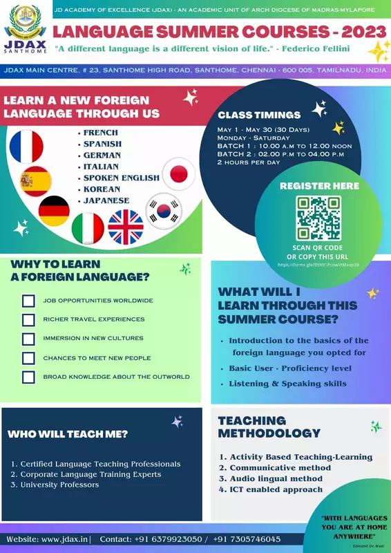 JD Academy of Excellence, an Academic unit of the Archdiocese of Madras Mylapore, based in Santhome is conducting courses in foreign languages during the holiday season. Though these courses are open to all, it will be ideal for school and college students.