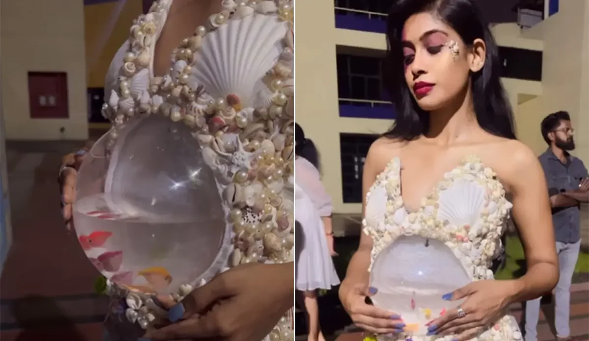 A fashion show was held in Chennai and a model was seen walking the ramp with live fish. She wore a mermaid style dress with a pot structure attached to it. A video of this fashion show was shared by the Instagram page Make Over by Preethi where a person is seen transferring small fish and water into the pot and the model is shown walking with the fish inside the pot.