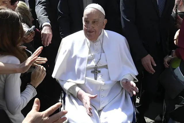 He waved at the crowd as he was pushed in a wheelchair unannounced to the front of the altar. He wished the congregation a ”Good Sunday” on the microphone. His voice appeared to sound better and stronger than when he addressed well wishers outside Gemelli hospital on the day of his discharge on March 23 after a five week hospital stay.