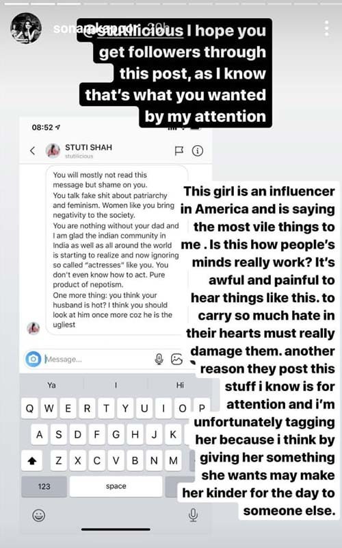 However, Sonam reacted with love. Instead of calling out the blogger, the actress tagger her and wrote, “I hope you get followers through this post, as I know that’s what you wanted by my attention.” The post also refers to Anand Ahuja as ‘ugliest’. Sonam further wrote, “This girl is an influencer in America and is saying the vilest things to me. Is this how people’s minds really work? It’s awful and painful to hear things like this. to carry so much hate in their hearts must really damage them. another reason they post this stuff I know is for attention and unfortunately, I’m tagging her because I think by giving her something she wants may make her kinder for the day to someone else.”