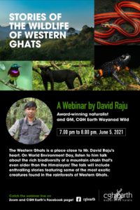 Did you know that the Western Ghats has a rich thriving biodiversity and that the mountain chain is even older than the Himalayas? If you are a nature lover, then don’t miss this webinar which will be on Facebook live on June 5th, 2021 at 7pm. David Raju will enthral you with wildlife stories featuring some of the most exotic creatures found in the rainforests of Western Ghats, which is very close to his heart.